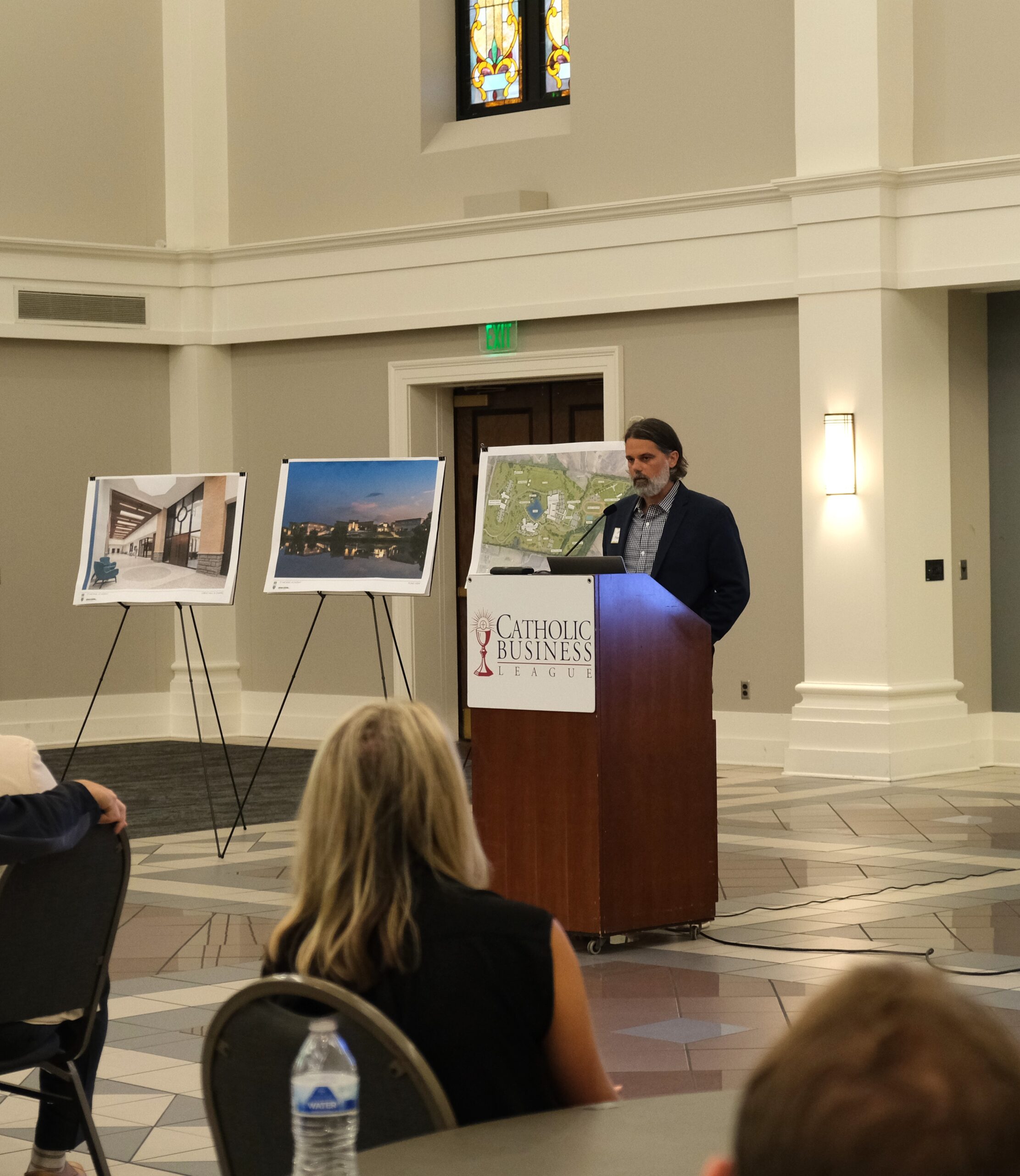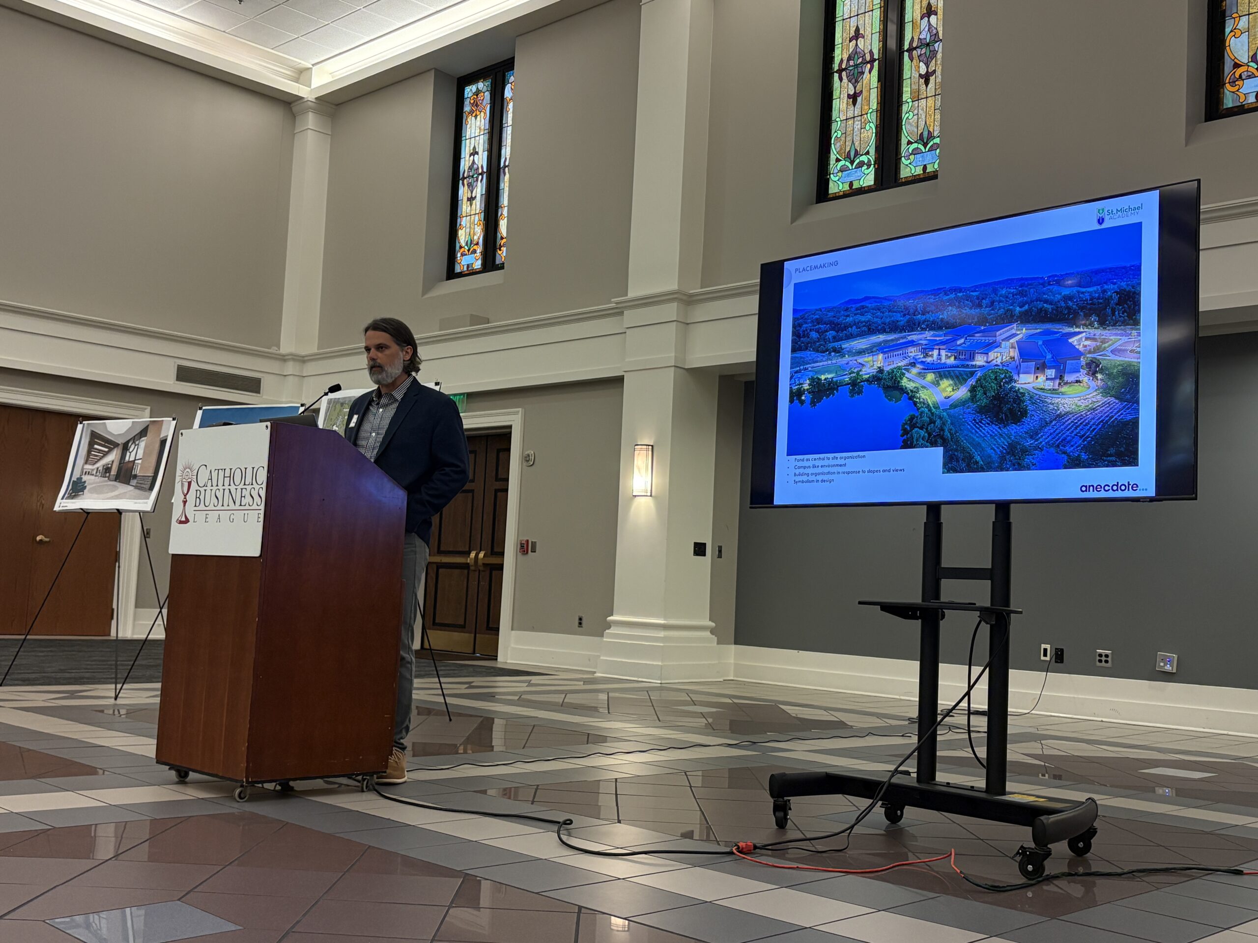 Josh discussed the school’s goals of creating Catholic beauty in an inspiring learning environment for students, and the many ways in which the 166-acre campus accomplishes those goals. He and his team at Anecdote — which has engaged with projects with the Country Music Hall of Fame, Acme Feed & Seed and many more spots throughout Nashville — visited many schools throughout the country as they designed their plan for St. Michael Academy, including multiple schools in Atlanta and one in Utah. The site features expansive views with slopes throughout the campus — including at the entrance — so visitors’ first sight of the campus includes a symbolic tie to St. Michael the Archangel with a wing-like design on the roof of the building. The symbolism extends into the school’s Great Hall, which includes a stained-glass window of St. Michael surrounded by panels resembling the four Gospels.